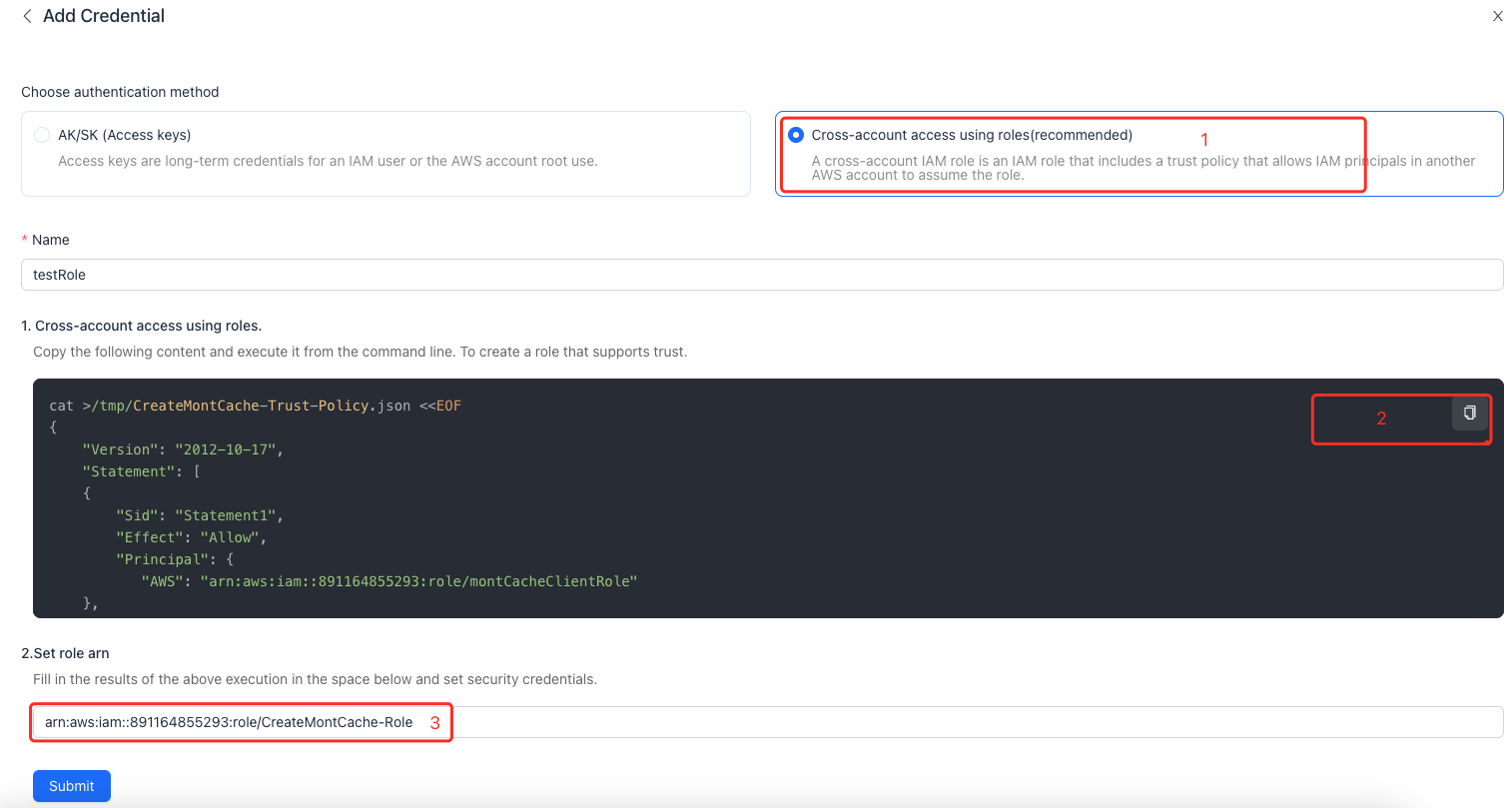 - Execute the automatically generated command in the EC2 command line under your AWS account and record the returned role ARN.