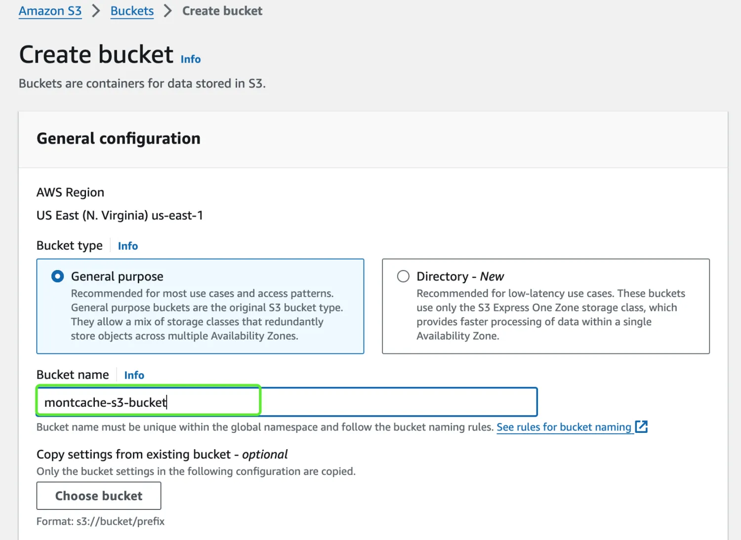 Note: The must also be unique across the entire AWS region. Recommended format: -s3-, such as: montcache-s3-us-east-1.